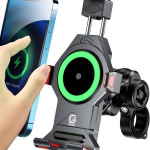 BRCOVAN Aluminum Alloy Motorcycle Phone Mount with Qi 15W Wireless Charger & Vibration Dampener, Anti-Theft Waterproof Motorcycle Handlebar Cellphone Holder, Adjustable Fit 4.7”-7.2” Smartphones